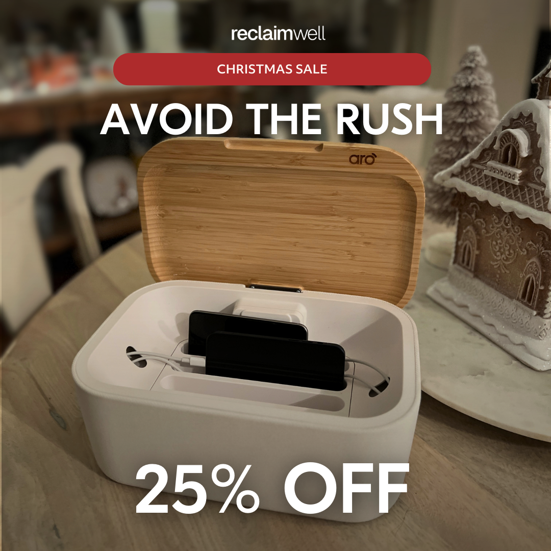 The Aro Box is your family’s central phone hub. An intentionality centerpiece that helps everyone put their phones away and be fully present for what matters most, Aro is designed to fit seamlessly into your home. It includes four interchangeable charging cables so the whole family can plug in any device and recharge together, creating space for moments of real connection. The Aro Box uses Bluetooth technology to automatically pair with the Reclaimwell app, available free from the App Store and Google Play, making it easy and fun to track your time away from your phone.