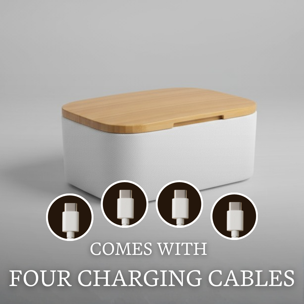 The Aro box ships with four USB-C charging cables (compatible with iPhone 15 and newer models and Android). Cables are interchangeable so they be replaced or used with Lightning cables (compatible with iPhone 14 and older models).